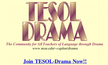 For more information about TESOL-Drama, please visit http://www.msu.edu/user/caplan/drama. TESOL members can join the e-group by sending an empty email to join-egroup-drama@lists.tesol.org or by visiting TESOL’s Web site (http://www.tesol.org/mbr/community/managesubs.html). You can also email the moderators (caplan@msu.edu, g.carkin@snhu.edu).